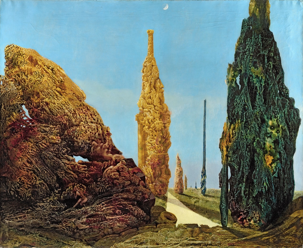 La moelle épinière humaine est un morceau de temps profondément fossilisé, tandis que l'intelligence humaine est une traversée de ses niveaux. L'anatomie de la colonne vertébrale fournit donc une clé symbolique pour comprendre où la modernité peut nous mener. Dans les tableaux du surréaliste espagnol Oscar Dominguez, Ballard discerne ce qu'il appelle énigmatiquement des "paysages spinaux", ou des imbrications de mondes intérieurs et extérieurs.8 Untitled (1936) de Dominguez représente des formes verticales abstraites qui ressemblent à des tours rocheuses. Ernst utilise la même technique dans des tableaux tels que Solitary and Conjugal Trees (1940). Les tours conçues par Goldfinger semblent représenter ces paysages de la colonne vertébrale, qui, aux yeux de Ballard, cachent un secret sur l’interaction entre le système nerveux humain et le monde extérieur. Dans son livre le plus expérimental, La Foire aux atrocités (1970), Ballard spécule, à propos de la "troisième guerre mondiale", que "c'est sur les champs de bataille de la moelle épinière que les blitzkriegs se livreront, avec pour modalités les attitudes que nous assumerons, nos traumatismes contrefaits par l'angle d'un mur ou d'un balcon."9