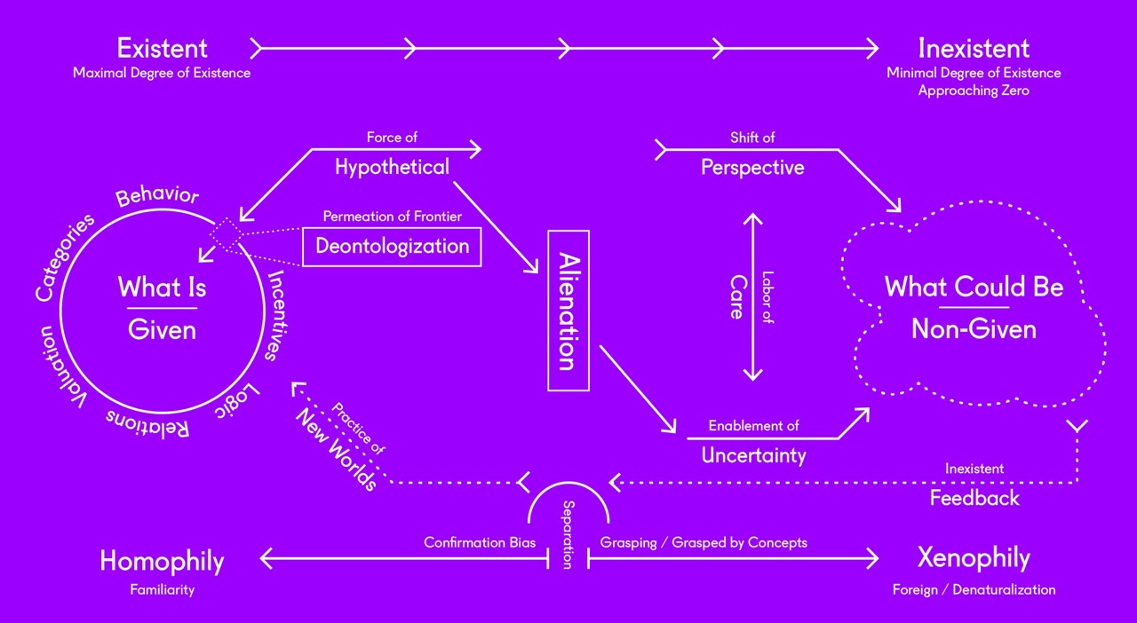 Insister sur la maîtrise cognitive ne revient pas à insinuer que ces types d’objets complexes peuvent être entièrement connus, parfaitement modélisés, contrôlés ou maîtrisés ; ni de dire que mieux les connaître équivaut directement à de meilleures actions ou stratégies. La causalité mécanique est révolue. Sachant avec certitude que nous ne pourrons jamais pleinement connaître ou déterminer de tels objets, ce qu’ils rendent en revanche de plus en plus manifeste, c’est la nécessité de mobiliser cette incertitude intégrale. Dans un effort pour contrer la corrélation entre incertitude et inaction (le fait de suspendre toute action en attendant une certitude absolue des sciences qui ne viendra jamais), Wendy Hui Kyong Chun a souligné que nous ne devrions ni "célébrer ni condamner […] les modèles scientifiques nécessaires pour aborder les risques invisibles et inaccessibles à l'expérience," mais plutôt considérer ces modèles (toujours imparfaits) comme des "outils hypo-réels, c’est-à-dire des outils pour formuler des hypothèses".15 Chun insiste sur la nécessité de transformer l’incertitude en un facteur d’activité grâce à la capacité de l’hypothétique, plutôt que de l’utiliser comme prétexte à l’inertie. Politiser l’incertitude à travers les capacités de l’hypothétique ne consiste pas à faire un saut grossier vers l’inconnu, comme l’a montré l’appropriation excessive de l’"incertitude" en tant que complexité par le pire de la politique post-moderne, qui exalte une potentialité infinie sans qualification.16 En tant que passerelle vers ce qui pourrait être, l’hypothétique n’est pas un simple acte de foi, mais une construction raisonnée d’un horizon conceptuel (puisque les horizons réels n’existent pas), nous orientant alors que nous traversons et travaillons avec ce qui n’est pas directement observable.17 Si l’inférence inductive nous aide à forger des schémas cognitifs sur ce qui est observable, elle constitue un mode de raisonnement de l’existant. Les hypothèses, en revanche, mettent en œuvre le raisonnement abductif, offrant des perspectives narratives pour ce qui dépasse (ou échappe à) l’observation et/ou la réalité connue (vérifiable). L’hypothétique ouvre un accès à l’inexistant, ou à ce qui pourrait être autrement, comme un nouveau diagramme sur lequel manœuvrer à nouveau. L’aliénation (générative) se définit comme la séparation entre ce qui est et ce qui pourrait être, servant d’articulation à la capacité d’action de l’incertitude, dont l’hypothétique est le principal vecteur.